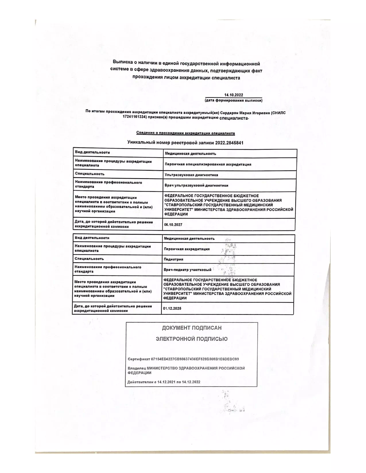 • 2022 — Ставропольский государственный медицинский университет (квалификация: врач-ультразвуковой диагност).